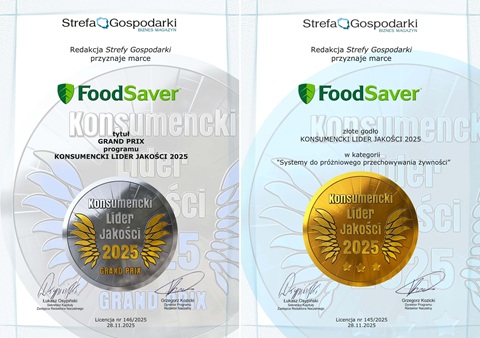 Marka FoodSaver została nagrodzona dwukrotnie w programie Konsumencki Lider Jakości 2025, organizowanym przez redakcję Strefy Gospodarki – Biznes Magazyn. To ważne potwierdzenie uznania konsumentów dla naszych systemów do próżniowego przechowywania żywności.